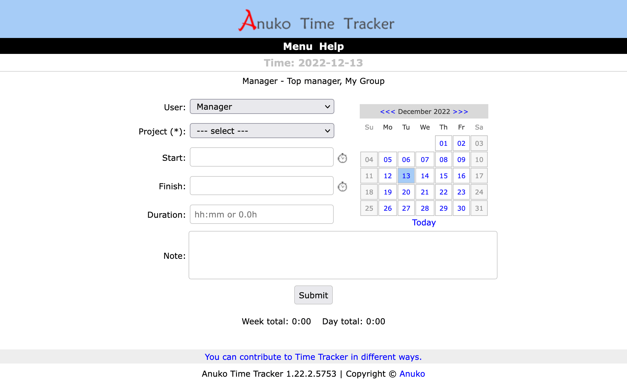 Anuko Time TrackerAnuko Time Tracker is an open source time management application. Anuko Time Tracker allows you to track the time that employees, colleagues, or teammates spend working on projects and tasks.
