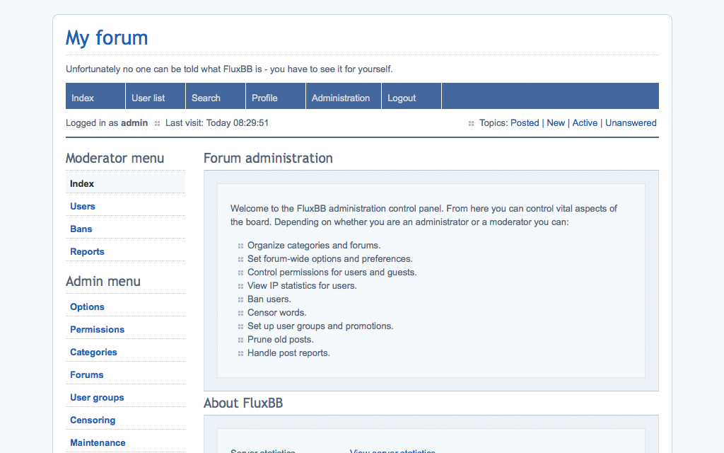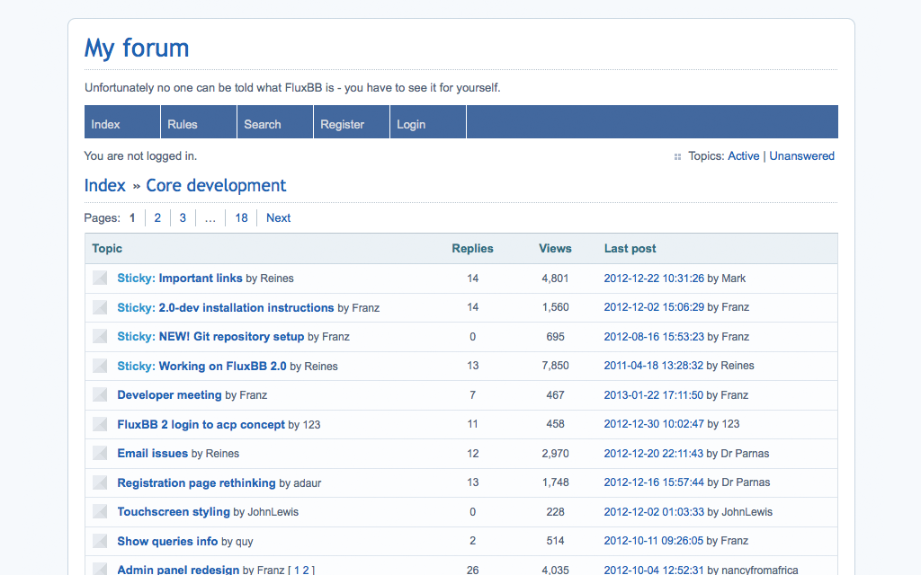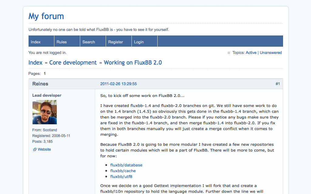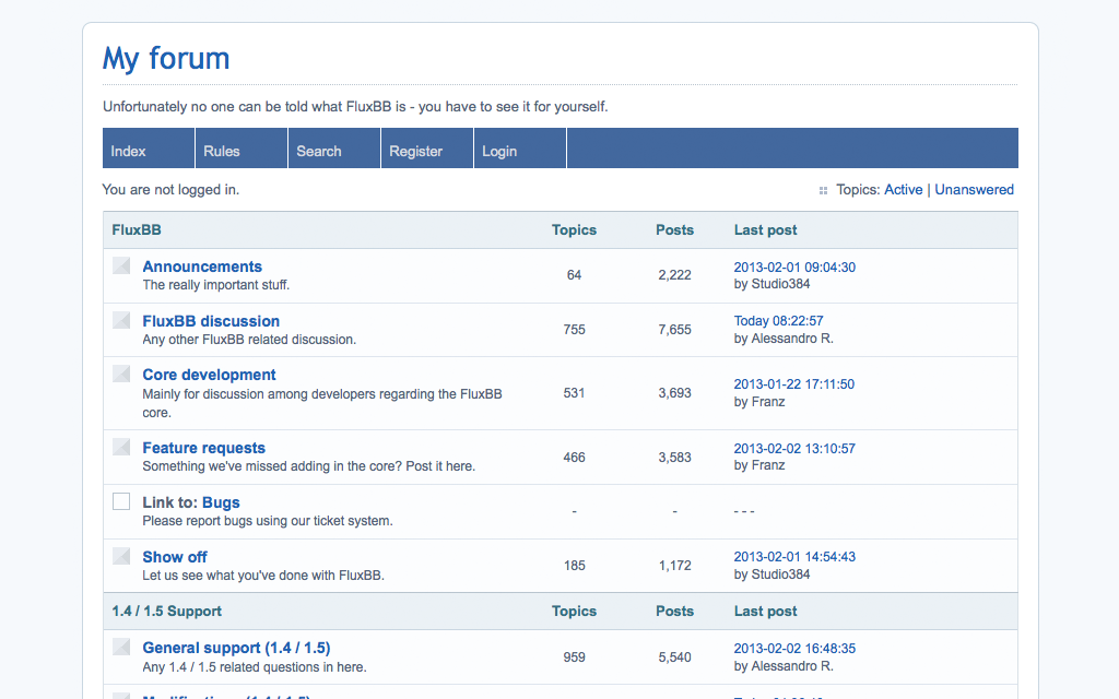 FluxBBFluxBB is an open source forum application. Forked from PunBB in 2008, FluxBB is a popular lightweight forum application, powering forums for Arch Linux and μTorrent. ![]() FluxBB is designed as a lighter, faster alternative to some of the traditional feature heavy forum applications. It is easy to use and has a proven track record of stability and security making it an ideal choice of forum for your website.