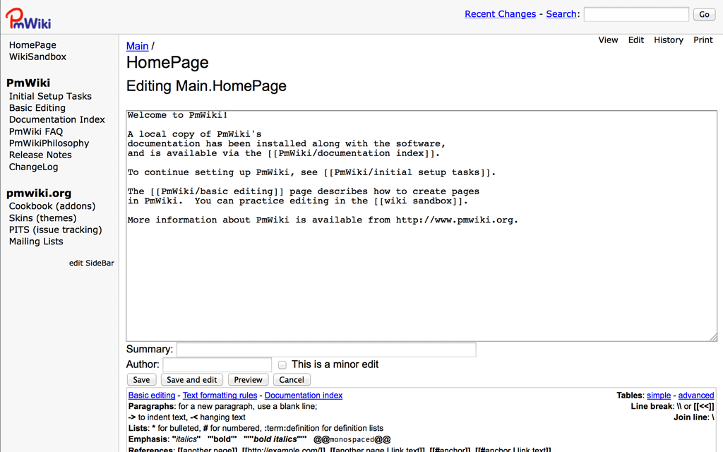PmWiki pages look and act like normal web pages, except they have an "Edit" link that makes it easy to modify existing pages and add new pages into the website, using basic editing rules. You do not need to know or use any HTML or CSS. Page editing can be left open to the public or restricted to small groups of authors.