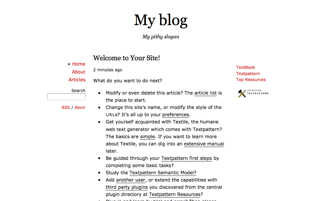TextpatternTextpattern is an open source blog application. Textpattern was initially released in 2003. ![]() Textpattern is an elegant content management system. Web designers, developers, publishers and bloggers love Textpattern's flexibility and extensibility. Textpattern has a powerful, sophisticated engine that can be infinitely tuned to suit whatever type of web site you can imagine.