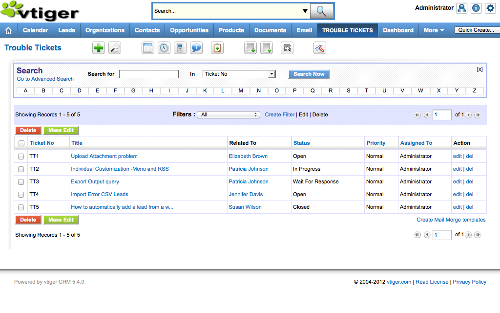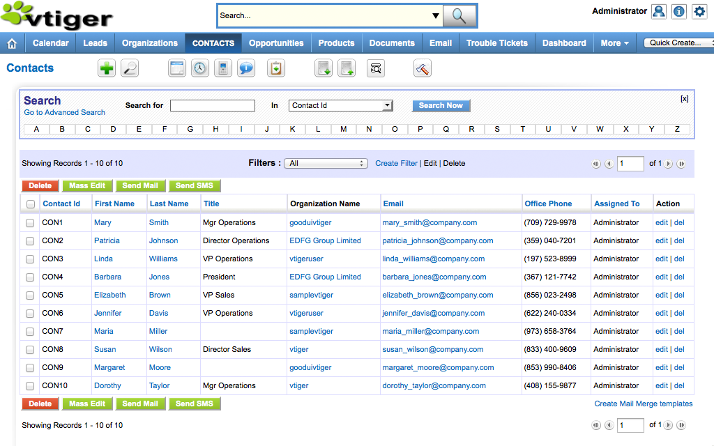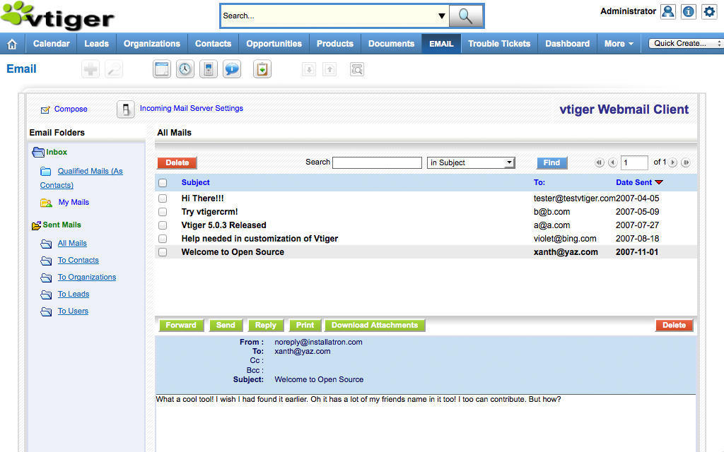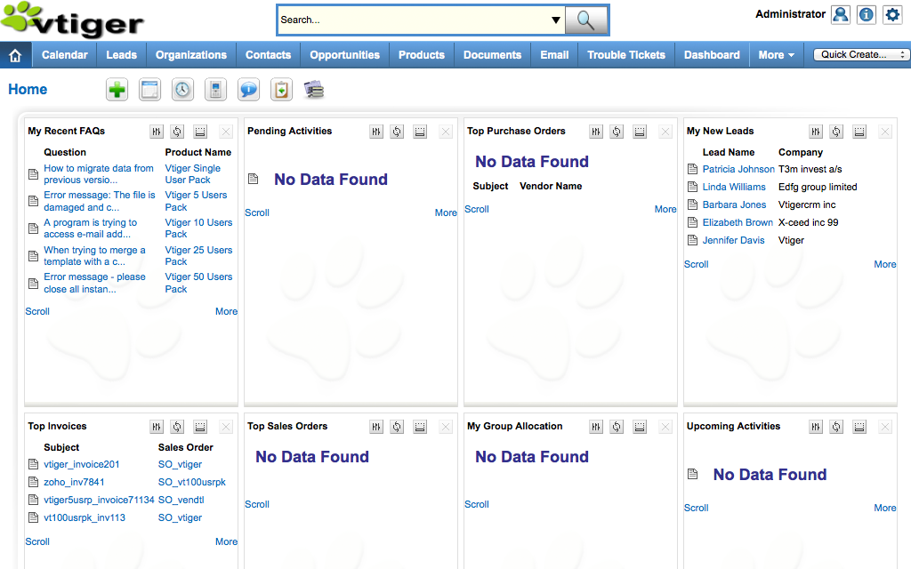Vtiger is an open source customer relations management application. Vtiger forked from SugarCRM Community in 2004, and today Vtiger powers operations for over 350,000 businesses and organizations worldwide.