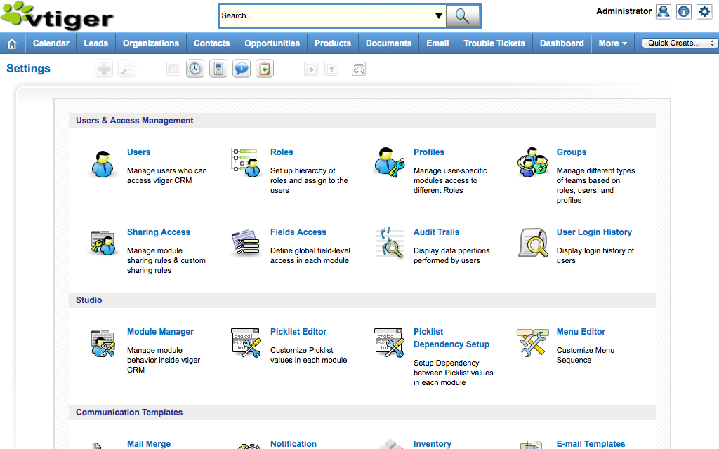 Vtiger already includes everything that you need to scale operations! Start out with email marketing, sales, quotes and invoices. As your business evolves, use additional calendar and activity management, customer portals, reports, inventory management, project management, and other tools.