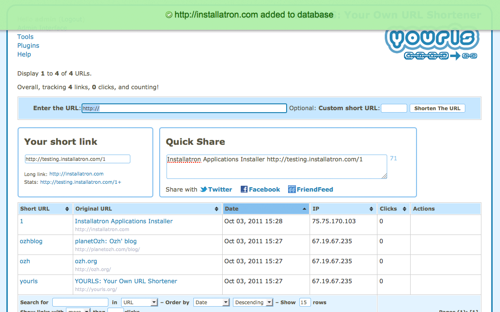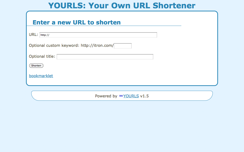 YOURLSYour Own URL Shortener (YOURLS) is an open source personal URL shortening application. ![]() YOURLS will allow you to run your own URL shortening service (a la TinyURL). You can make it private or public, you can pick custom keyword URLs, it comes with its own API. You will love it.